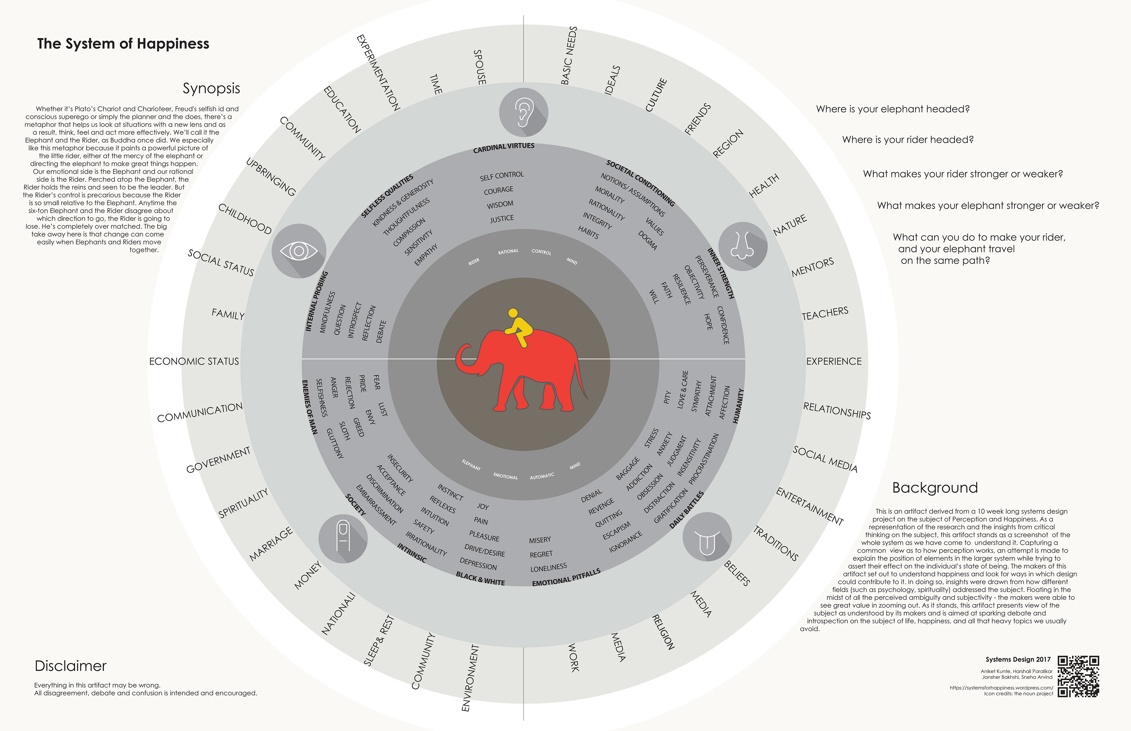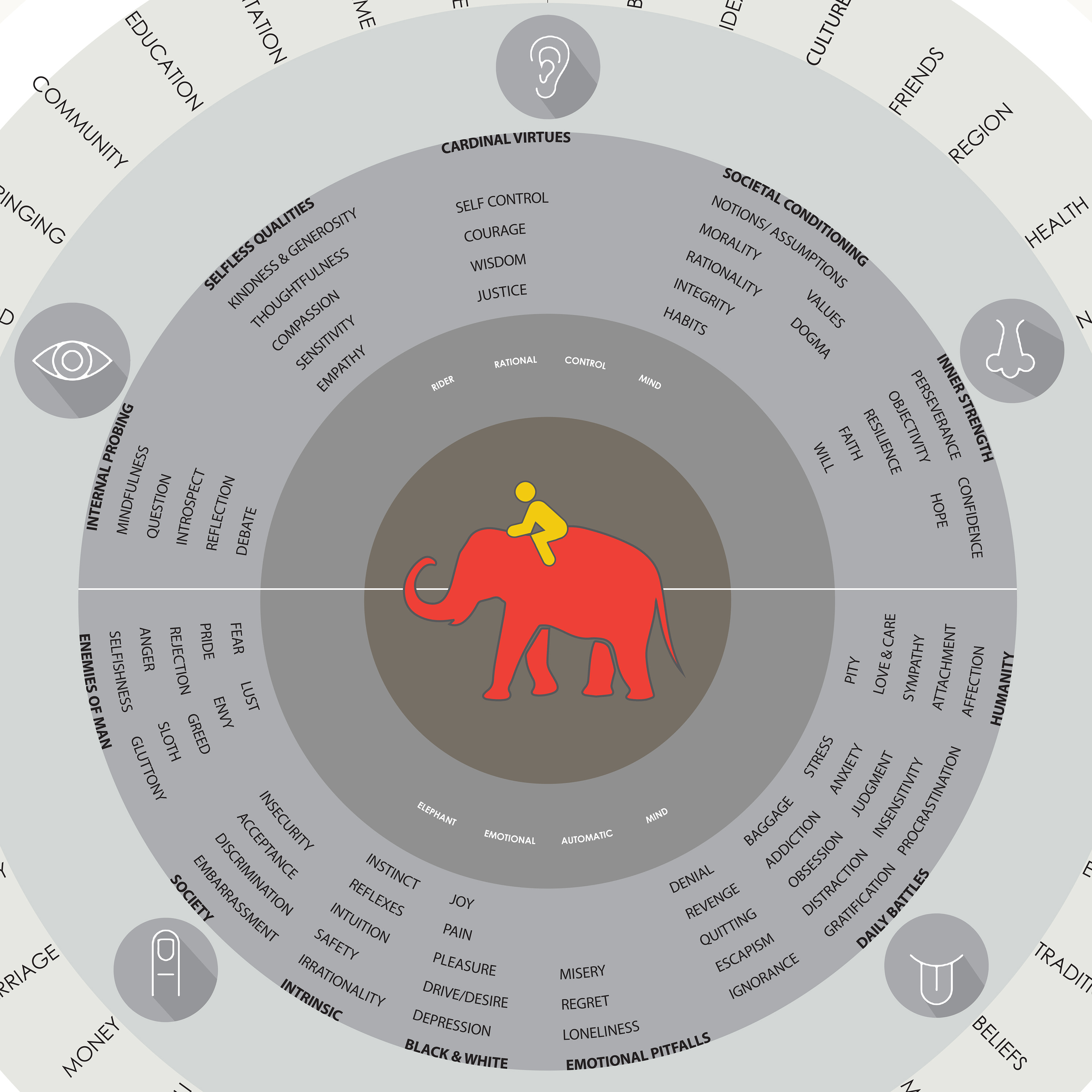Elephant and the Rider, as Buddha once did. Our emotional side is the Elephant and our rational side is the Rider. Perched atop the Elephant, the Rider holds the reins and seen to be the leader. But the Rider’s control is precarious because the Rider